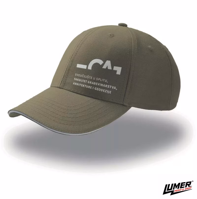 Piping in contrasting color on the peak, reinforced front panel, stitched eyelets, fabric fastener with metal buckle